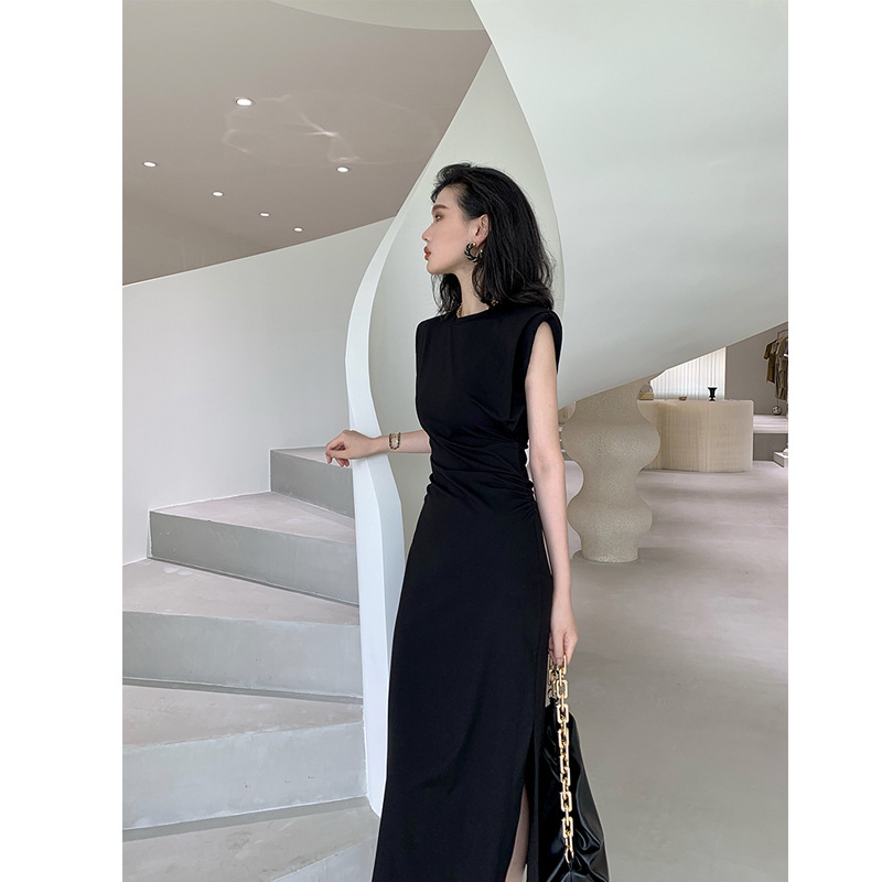 粤聚兴腔调拿捏 垫肩法式连衣裙夏季新款设计感收腰黑色长裙