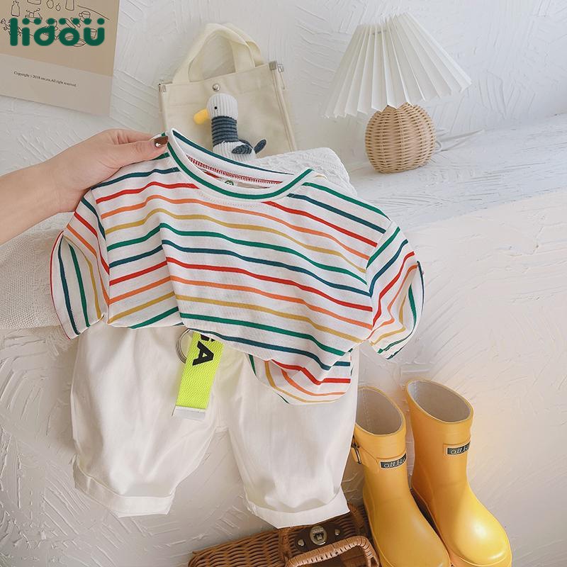 彩虹条纹T 韩国儿童洋气百搭薄款短袖上衣男女童休闲透气T恤衫潮