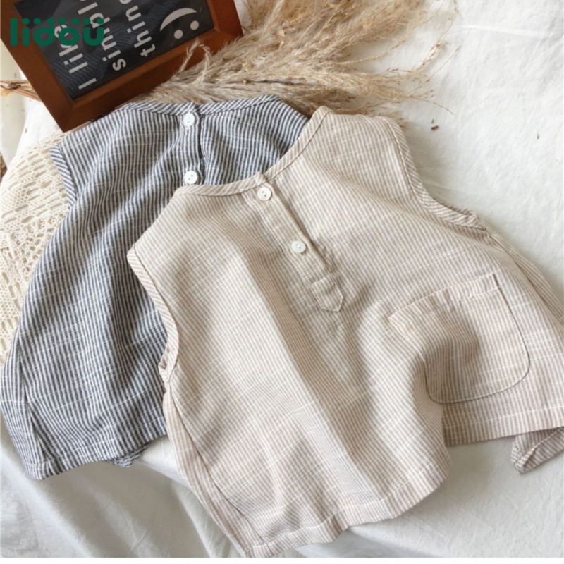后开叉洋气时髦 韩国儿童竖条棉麻清凉背心男女童无袖上衣2021夏