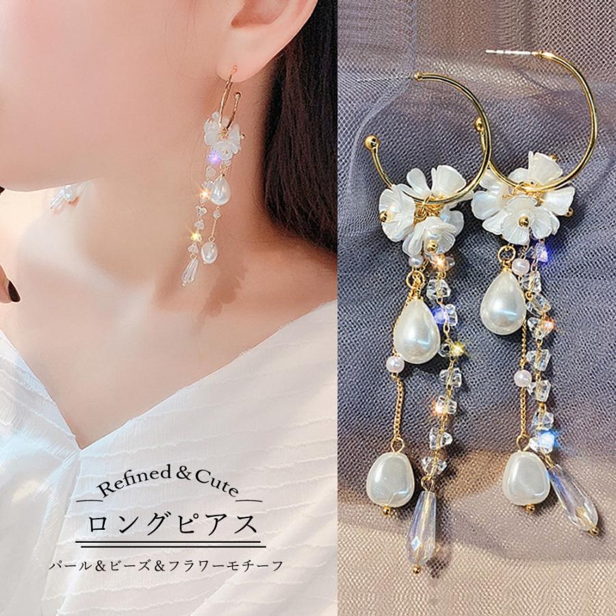 パール ロングピアス フープ 大きめ ピアス かわいい チェーンピアス レディース ぶらさがり【ネコポス可】