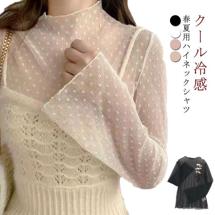 ハイネック 長袖 夏用 レディース tシャツ クール冷感 薄手 レース インナー 重ね着 日よけ 紫外線対策 日焼け止め 水玉カットソー ボトルネック