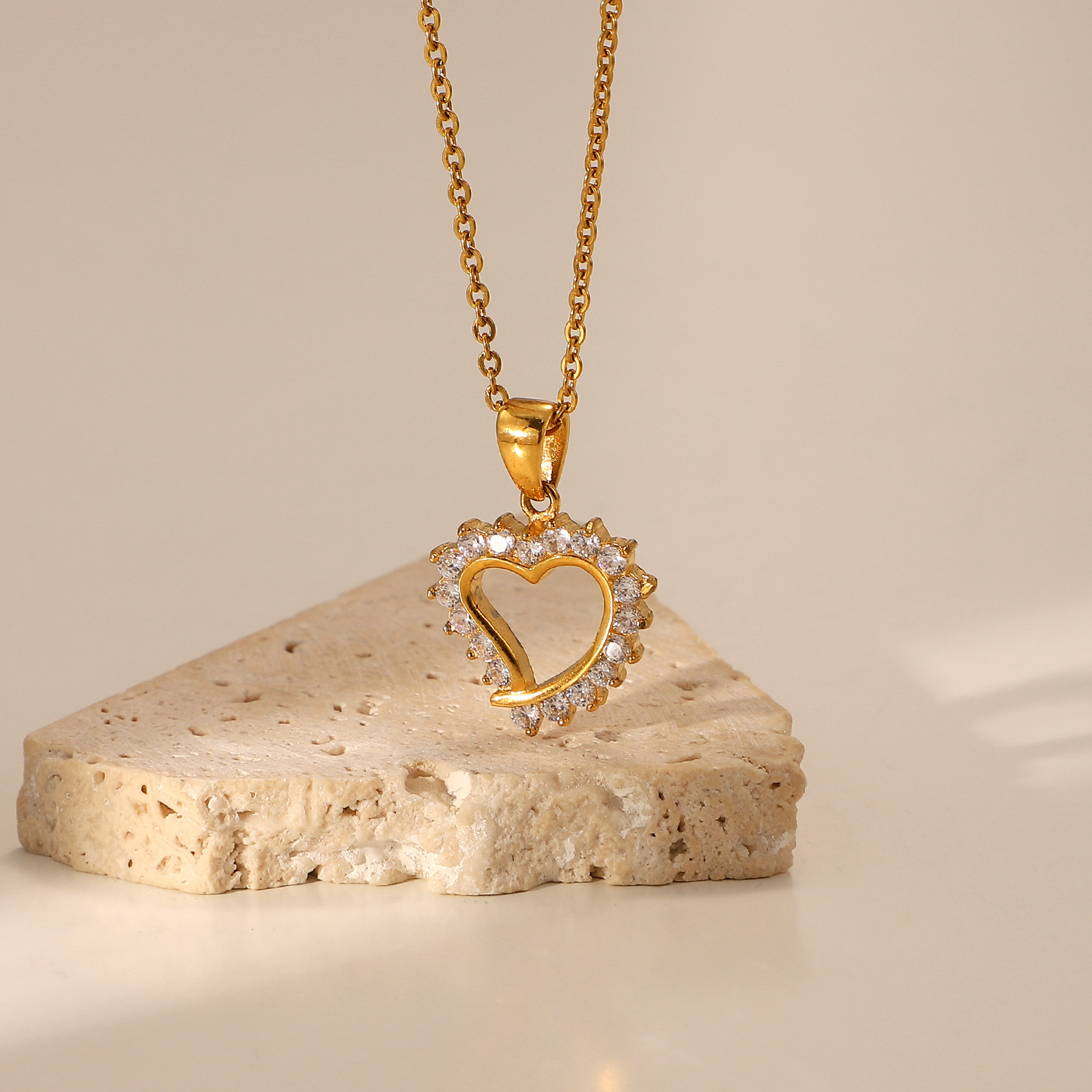 欧美INS网红项链18K金不锈钢镂空心形白色锆石镶边吊坠项链饰品女