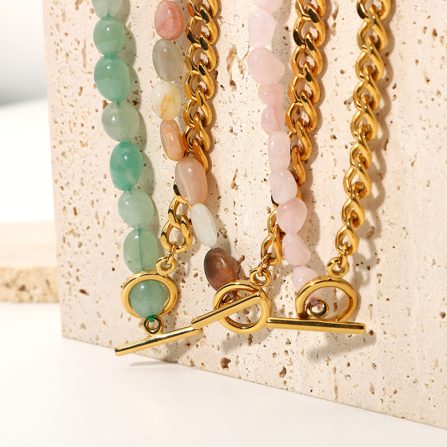 欧美不锈钢18K金不锈钢珠宝OT扣彩色天然石串珠缝合古巴女性项链