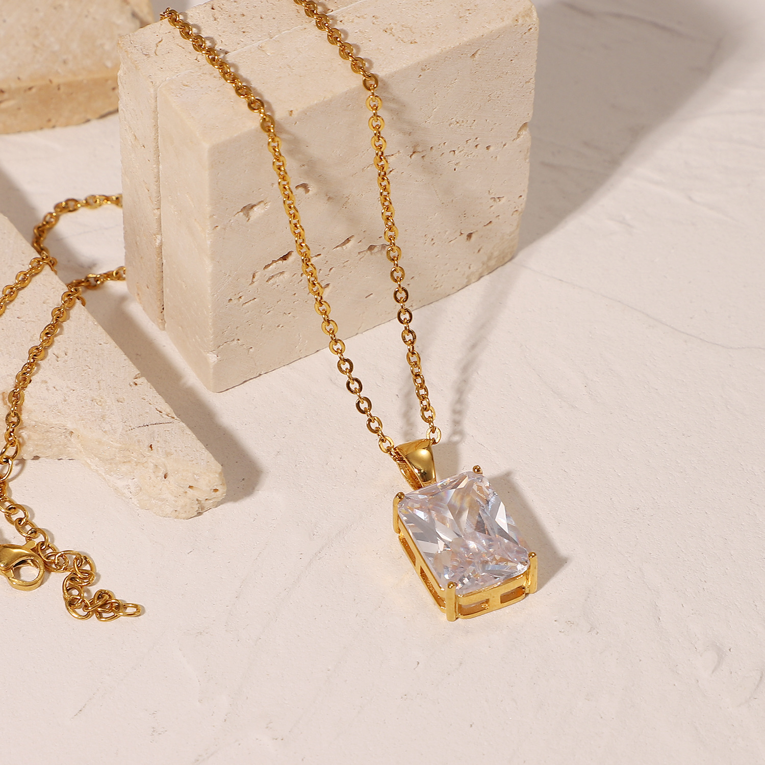 欧美跨境饰品ins流行18K不锈钢13×18mm大块方糖白色锆石吊坠项链