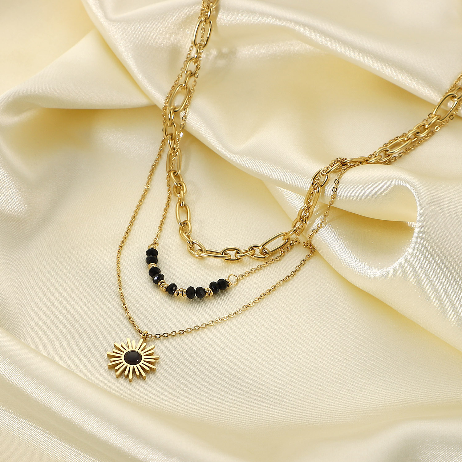 欧美INS网红同款女黑色米珠太阳花吊坠三层项链 独立包装复古项链