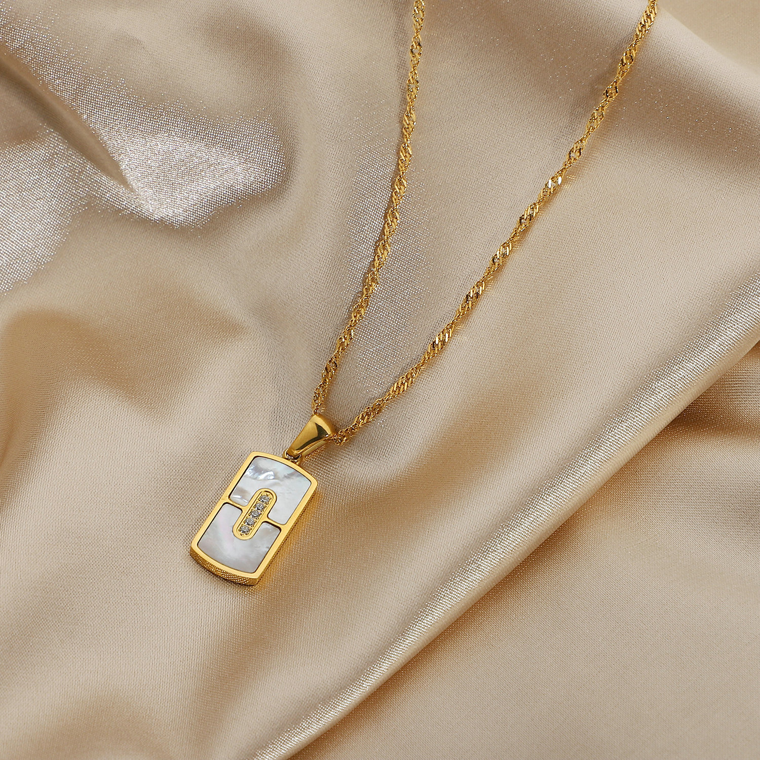 欧美优雅锆石密镶矩形贝壳吊坠项链 多用途18K镀金不锈钢长项链女