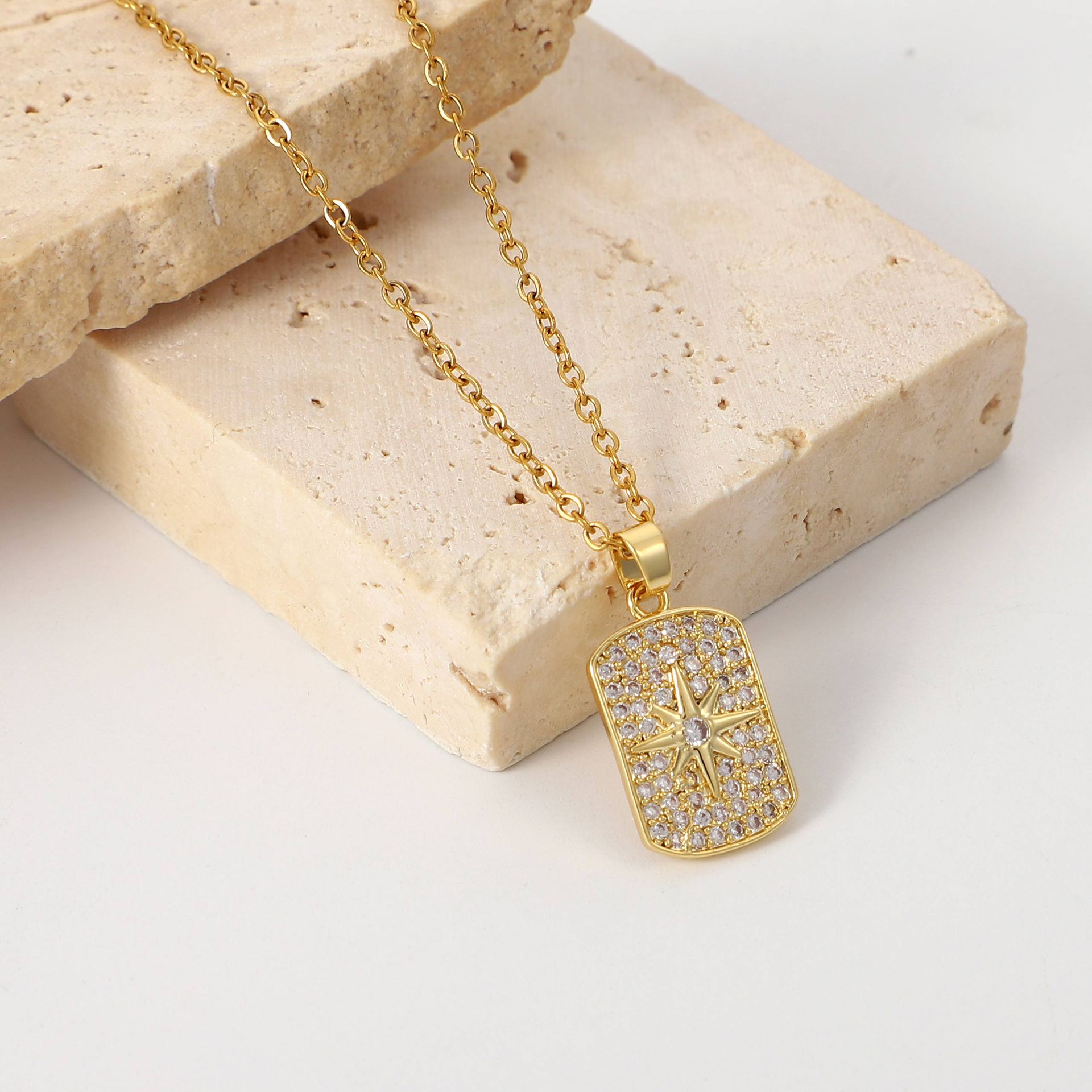 新款18K镀金项链首饰 不锈钢八角星星女式全锆石方形吊坠项链饰品