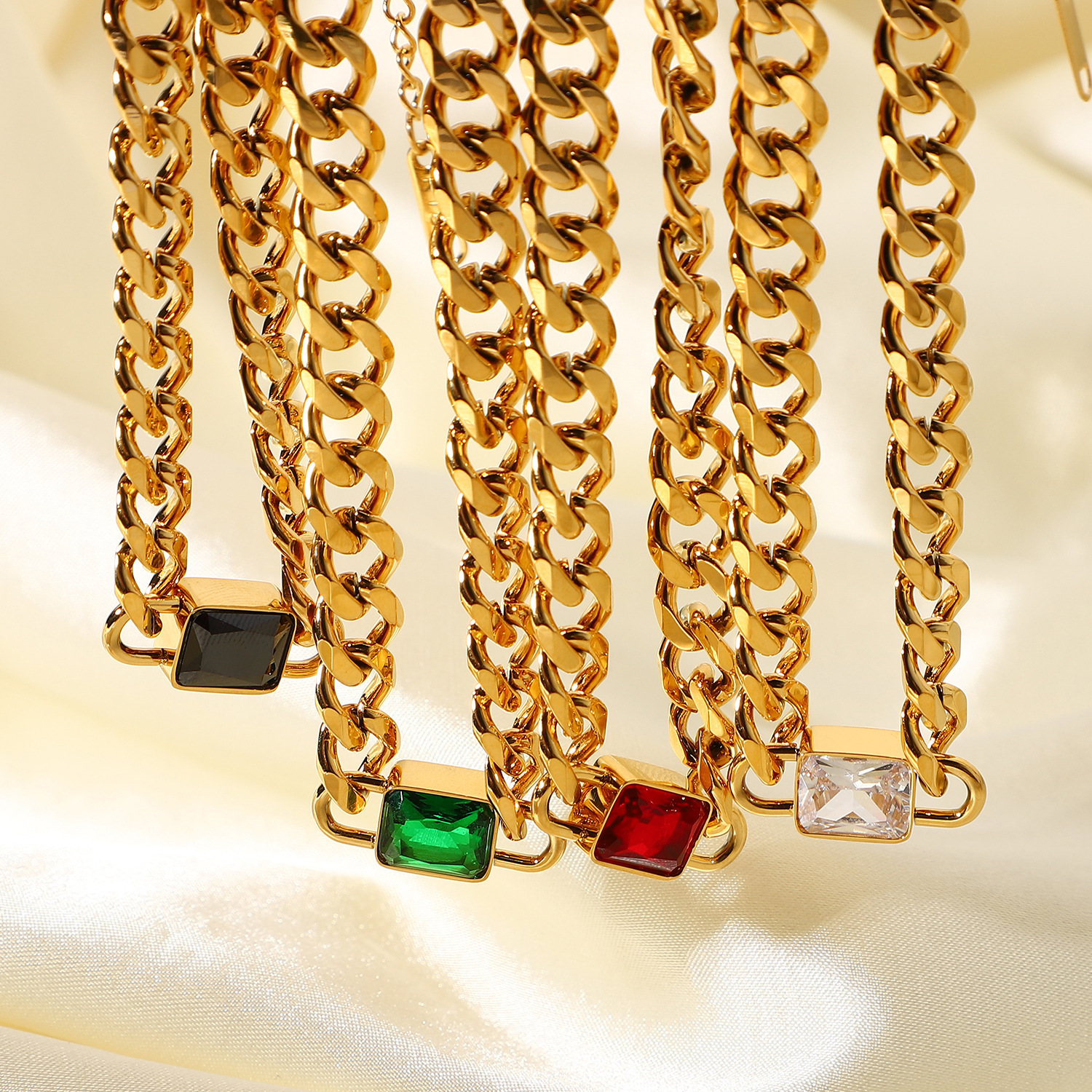 欧美INS同款项链不锈钢首饰18K金长方倒角彩色半宝石吊坠项链女士