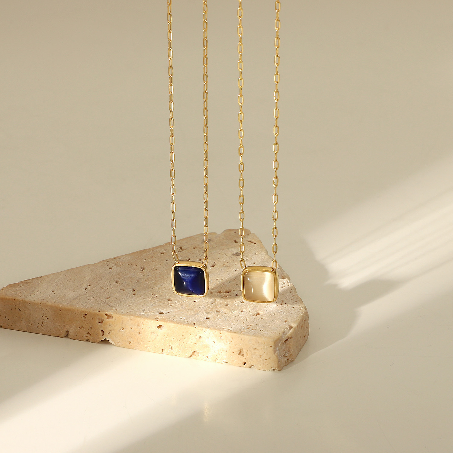 欧美INS网红同款钛钢项链14K镀金不锈钢猫眼石方形吊坠金项链女式