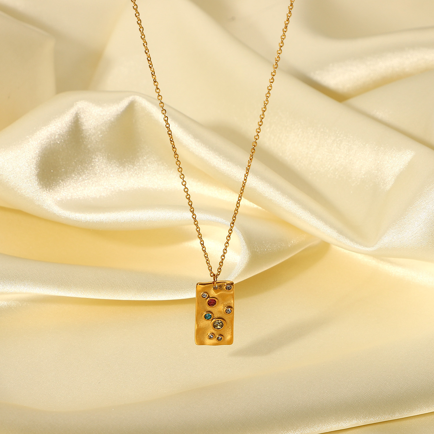 欧美网红同款时尚复古项链 18K金电镀不锈钢彩锆锤纹方形吊牌项链