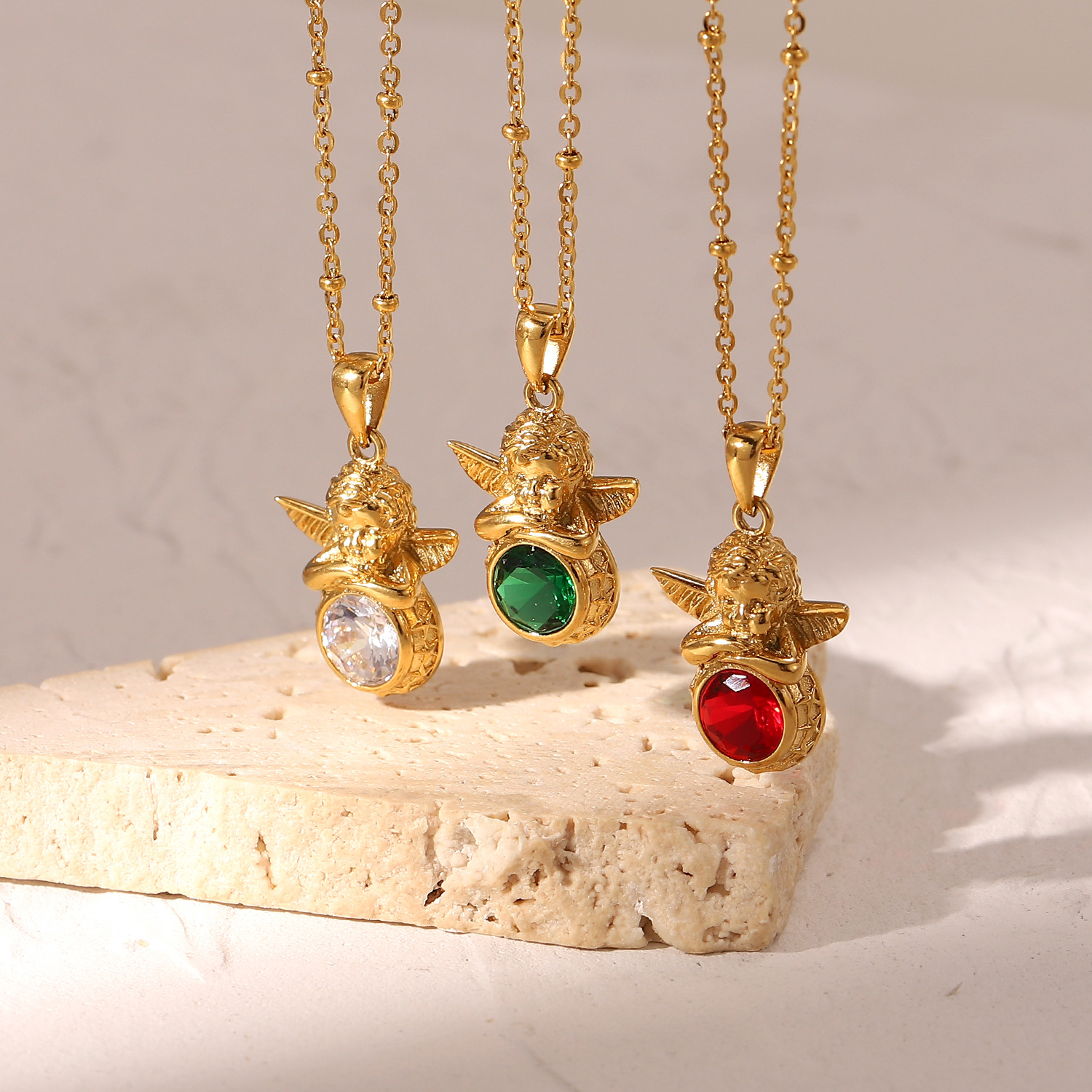 18K镀金天使圆形亮粉色锆石项链 不锈钢丘比特天使锆石吊坠项链女