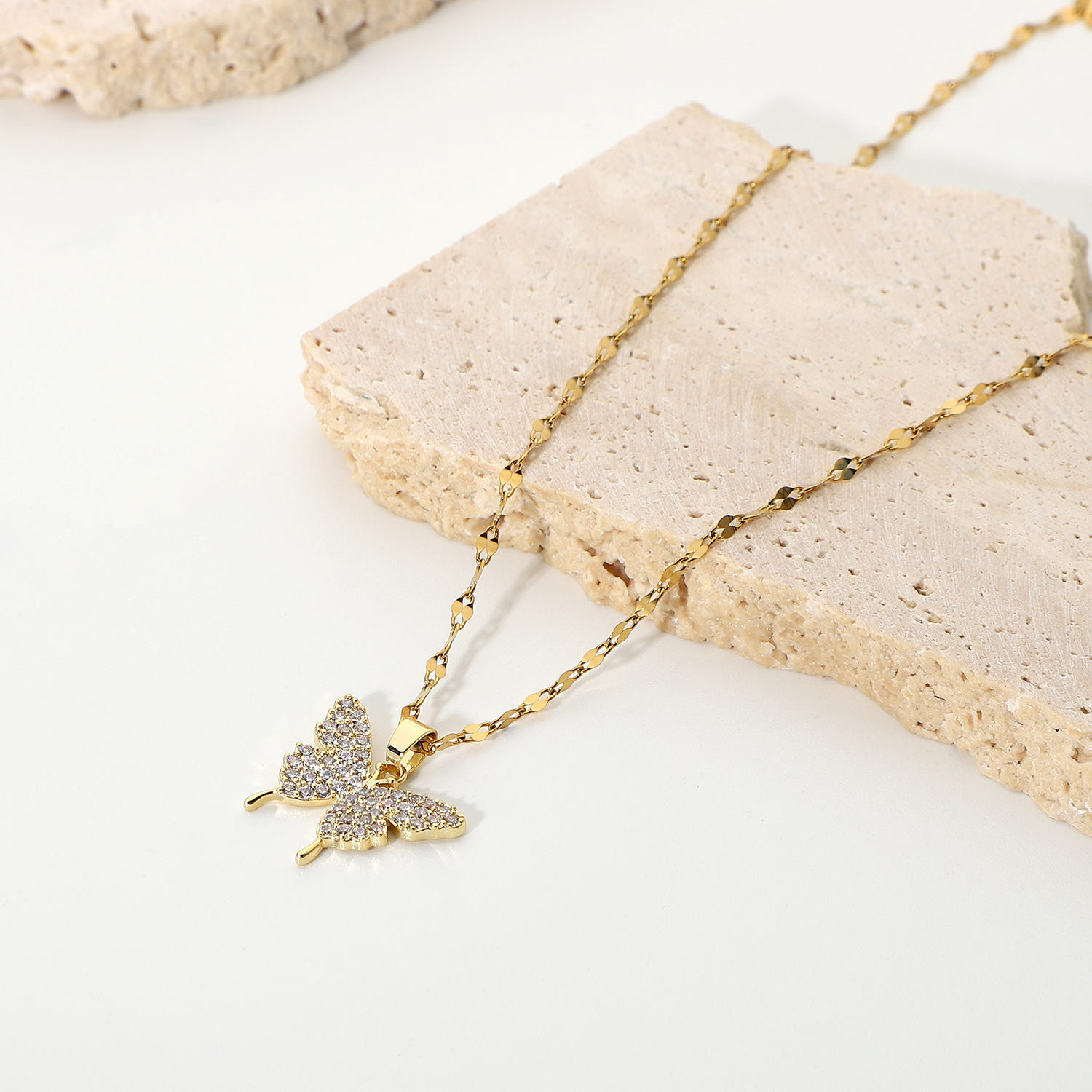 欧美简约ins新款满锆蝴蝶吊坠项链18K电镀金不锈钢项饰项链饰品女