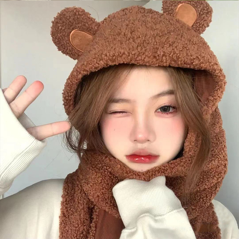 熊抱围巾一体小熊帽子围脖手套女秋冬可爱毛绒保暖护耳头套