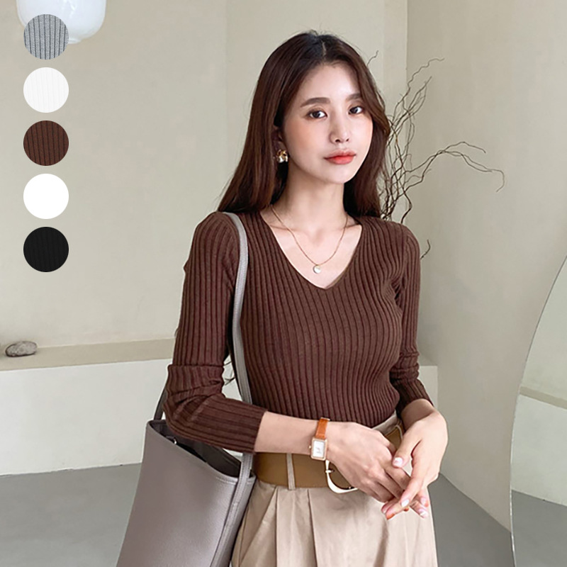 日韩新品 2021秋冬新款打底衫女式毛衣5色现货V领长袖打底上衣女