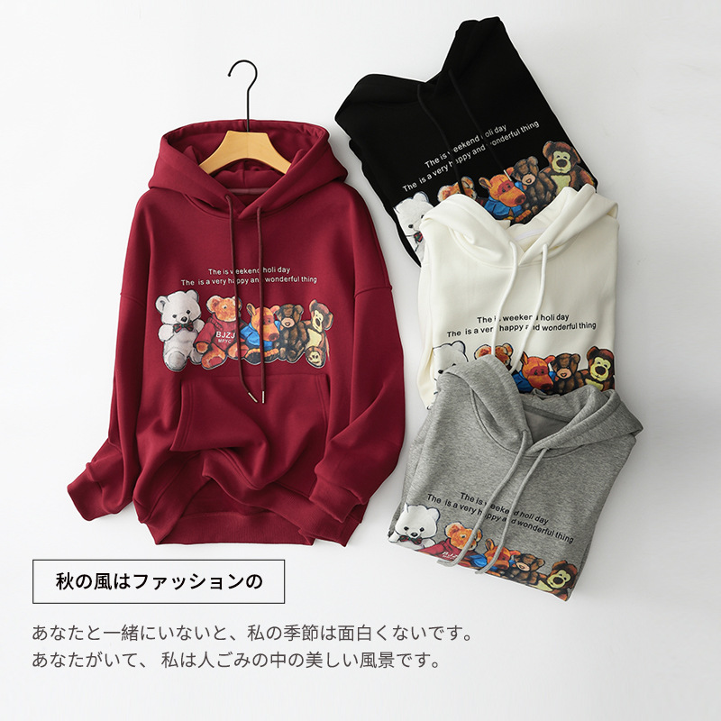 定制加绒加厚秋冬落肩袖小熊连帽衫韩版宽松少女感卫衣炸街高级感