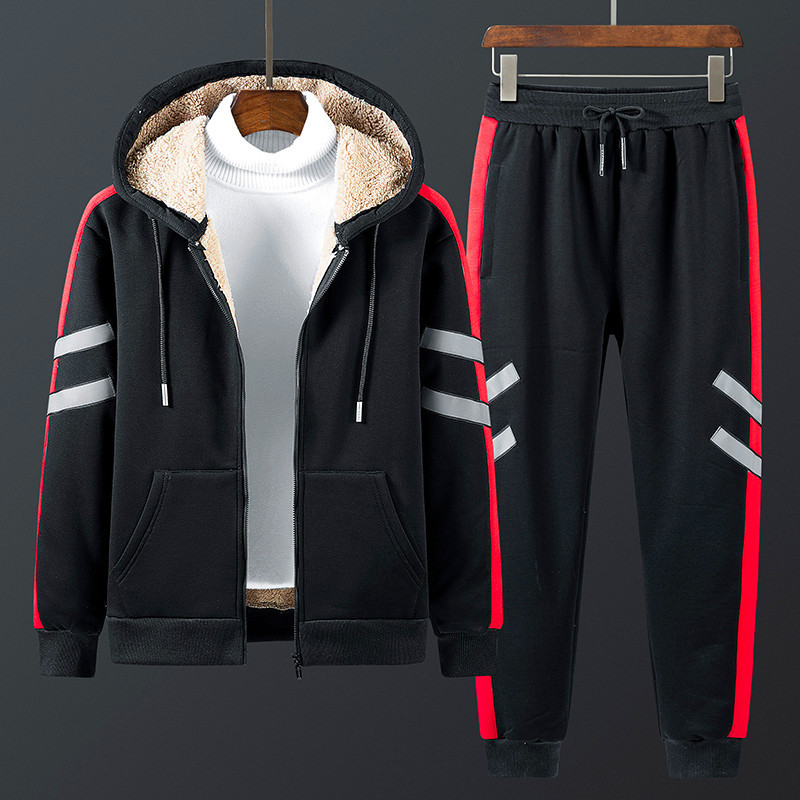 加绒套装男士2021冬季新款连帽加厚羊羔绒卫衣长裤两件套韩版一套