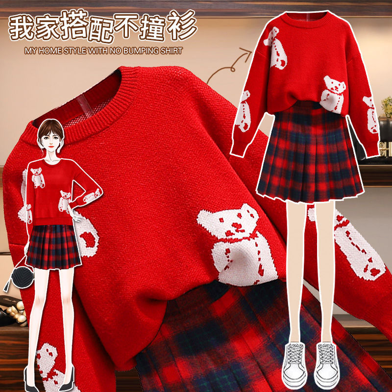 大码女装200斤胖妹妹冬季套装女显瘦针织毛衣半身裙拜年服两件套【