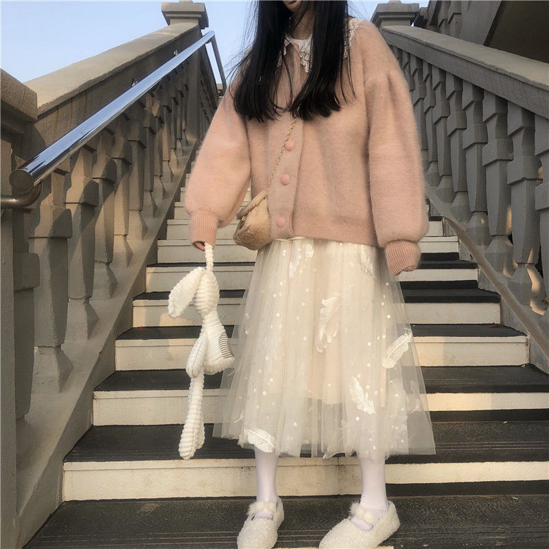 【两件套】毛衣开衫外套+高腰网纱半身裙韩版秋冬时尚套装女学生