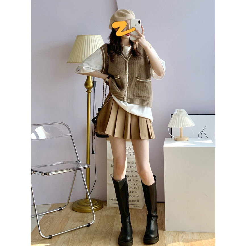 【三件套】韩系复古叠搭毛衣马甲+长袖衬衫+a字半身裙秋冬套装女