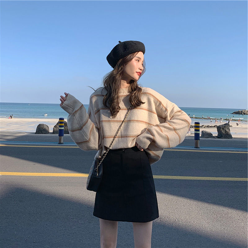 2021年秋冬款宽松条纹套头毛衣搭配短裙套装针织衫包臀裙两件套