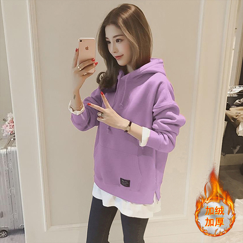 韩版2021秋冬新款连帽棉质薄款卫衣假两件加绒加厚卫衣女一件代发