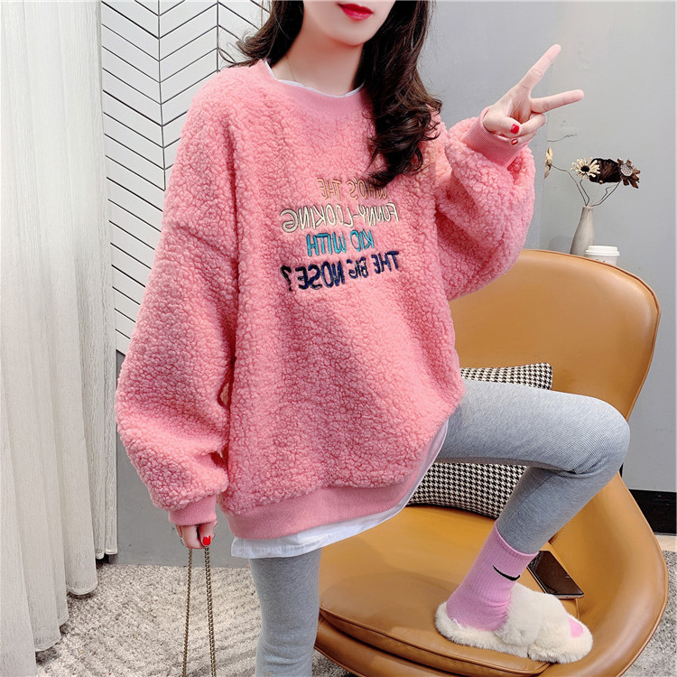 刺绣字母仿羊羔绒圆领卫衣女秋冬加绒加厚假两件上衣跨境女装批发