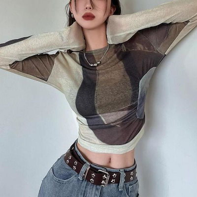 2025春夏 長袖 Tシャツ ショート丈カットソーレイヤード風重ね着トレンドプリントラウンドネックK-POPトップスロンT韓国系ストリートへそ出しタイト肌見せTファッションレディースかわいいミニサイド