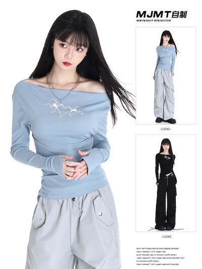 2025秋冬 長袖 Tシャツ ショート丈 カットソーラウンドネックUネックK-POPトップスカジュアル配色韓国系ストリートへそ出しタイトスリーブ 肌見せ T ファッションレディースかわいいサイド衣装風
