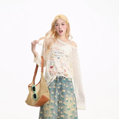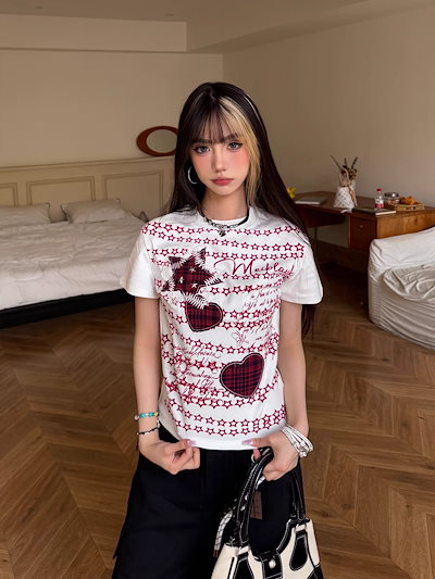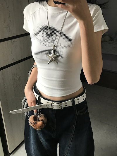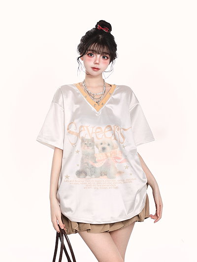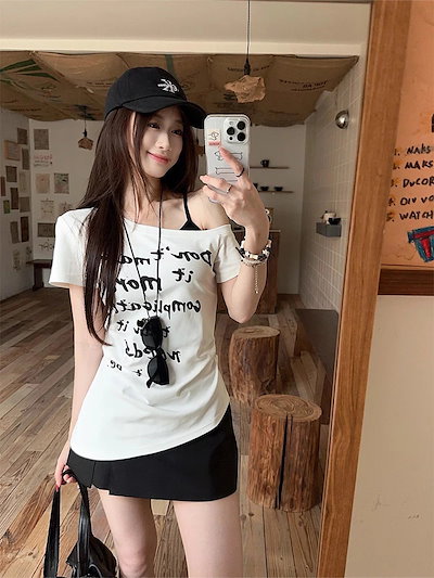 2025春夏 Tシャツ レディース 半袖 韓国風 プリント ショート丈 トップス スポーツミックスストリートフィット感おしゃれ系グラフィックラウンドネックスリーブカジュアル大人可愛いスポーティー配色T