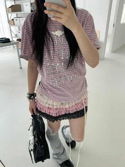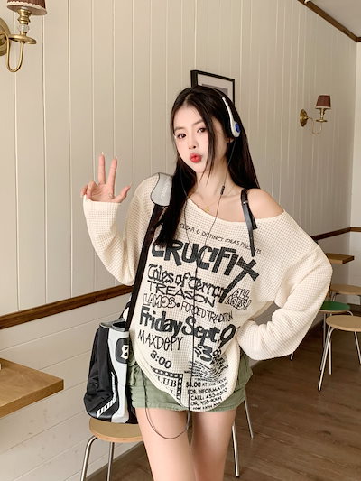 2025春夏 韓国可愛い風トップス レース切り替えTシャツ K-POPファッション長袖ストリート系サイド丈フットシルエットシャツ衣装レディースサイズVネックユニセックスおしゃれカジュアルダンスラグラン