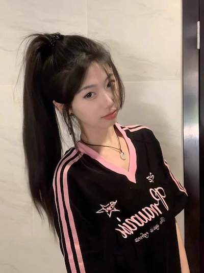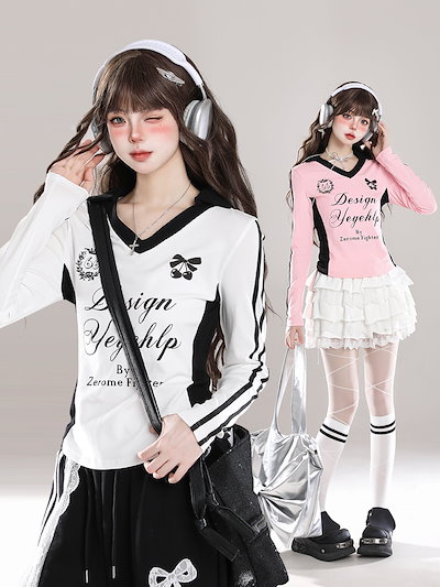2025春夏 Tシャツ長袖韓国風Vネックプリントダンスショート丈タイトトレンドトップスレディーススポーツミックスストリートバイカラーおしゃれ系スリーブカジュアル大人可愛いスポーティー配色フットサイドT
